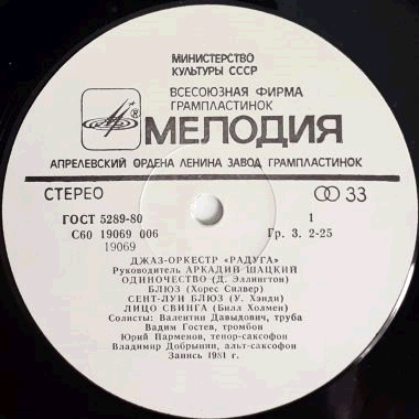 | A Russian big band led by Arkady Shatsky, playing mixture of traditional and modern jazz. Nice versions of "Solitude" (Ellington), "Blues" (Silver), "Saint-Louis Blues (Handy), "Big Swing Face" (Holman), "Give It One" (Ferguson), "Trumpet Boogie" (Anthony), "Dat Dere" (Timmons) and "Piece for Orchestra" (Q.Jones).