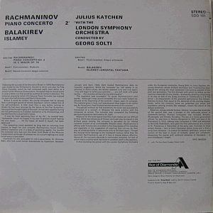 Rachmaninov's "Piano Concerto No. 2 in C minor, Op. 18" and Balakirev's "Islamey - Oriental Fantasia" performed by Julius Katchen (piano) with the London Symphony Orchestra, conducted by Georg Solti. Reissue of Decca SXL 2076 (England 1959). Early / mid 1970s pressing, I should think.