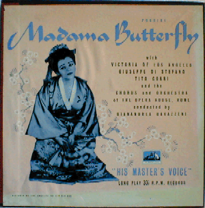 | Great recording of Giacomo Puccini's highly popular opera "Madame Butterfly" sung in Italian, featuring e.g. Victoria de los Angeles, Giuseppe di Stefano and Tito Gobbi. Mono.