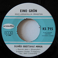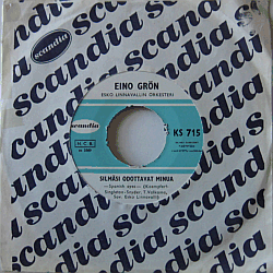 Valkoinen etiketti leveällä vaalean sinivihreällä keskirannulla. Vasemmalla mustavalkoinen Scandian ovaalilogo. Levy-yhtiön paperipussi. Hieman kärsinyt yksilö.
