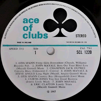| Already rare compilation of great blues tracks by Otis Spann, John Mayall, Champion Jack Dupree, John Mayall & Steve Anglo (= Stevie Winwood), Curtis Jones, John Mayall & Eric Clapton and Peter Green & John Mayall, backed by e.g. Tony McPhee, Malcolm Pool, Keef Hartley, John McVie and Aynsley Dunbar. I guess about half of the tracks are taken from previously released material, including the mega rare Mayall & Clapton single "Lonely Years / Bernard Jenkins", released originally on Purdah in 1966. Later pressing from the early / mid 1970s, I should think...