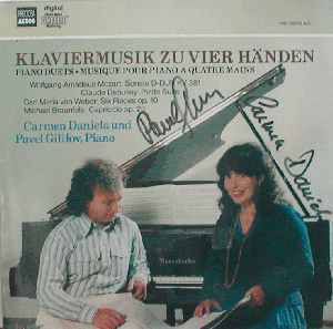 Piano duets by Wolfgang Amadeus Mozart ("Sonate D-dur KV 381), Claude Bebussy ("Petite Suite"), Carl Maria von Weber ("Six Pieces Op. 10") and Michael Braunfels ("Capriccio Op. 23).