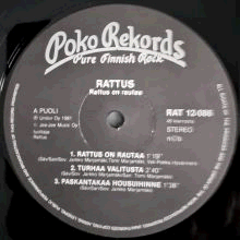 Black labels with white print. Black and white Poko Rekords "Pure Finnish Rock" logo at the top.