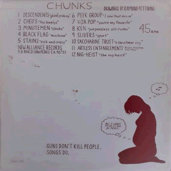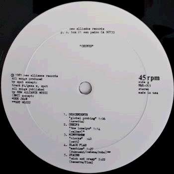| A rare American punk / hardcore compilation, 12-inch 45 rpm extended play / mini-album. A total of 12 short tracks by Descendent, Cheifs, Minutemen, Black Flag, Stains, Peer Group, Vox Pop, Ken, Slivers, Saccharine Trust, Artless Entanglements and Nig-Heist.