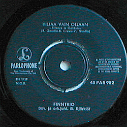 Musta etiketti hopeateksteillä. Vasemmalla Parlophonen kuvalogo.