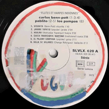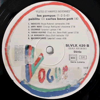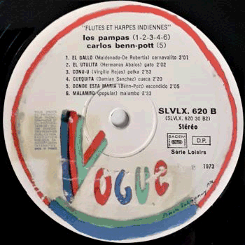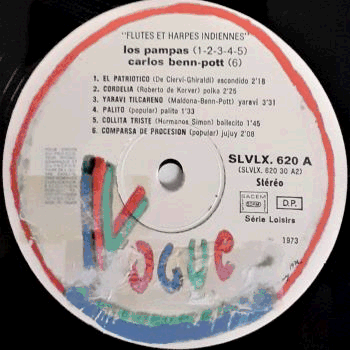 | A total of 18 South American tracks performed by Pablito, Los Pampas and Carlos Benn-Pott. The musical style of each track is described as follows: vicunita, jarabe, huajra, cueca, galopa, bailecito / escondido, polka, yaravi, palito, bailecito, jujuy / carnavalito, chacarera, galopa, yaravi, bailecito, cueca, carnavalito, gato, polka, cueca, escondido, malambo. An excellent Double Loisirs series issue from Vogue!