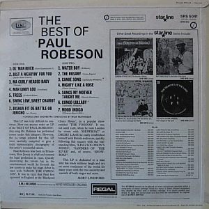 | A world-famous American scholar, actor, athlete and singer, also a freedom fighter for the negro culture, born in 1898 in Princeton, New Jersey. A compilation of previously released material. A total of 14 songs including "Ol' Man River", "Trees", "Songs My Mother Taught Me", "The Rosary", "Mood Indigo", "Joshua Fit de Battle ob Jericho" and "Swing Low, Sweet Chariot". Electronically reprocessed for stereo.