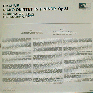 | Brahms' "Piano Quintet in F minor, Op. 34", performed by Shuku Iwasaki with The Finlandia Quartet. Very rare Finnish album, not available on CD, I should think.