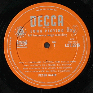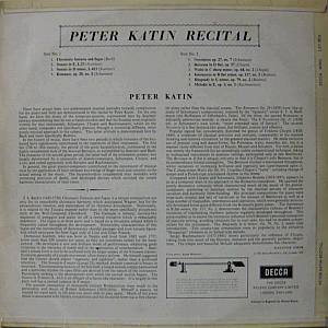 | Peter Katin plays Bach, Scarlatti, Schumann, Chopin, Brahms and Rachmaninov. Mid 1960s mono issue, no SXL stereo version exists.