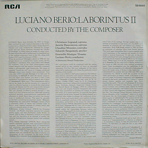 | Luciano Berio's "Laborintus 2", performed by Emsemble Musique Vivante, featuring Christiane Legrand, Janette Baucomont and Claudine Meunier (> all three from Les Swingle Singers) on vocals, and Edoardo Sanguineti as the speaker. Conducted by Berio himself. UK issue of Harmonia Mundi HM 764 (France 1970).