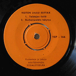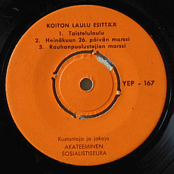 Viiden biisin EP (45 rpm): "Taistojen tiellä" / "Buchenwaldin hälytys // "Taistelulaulu" / "Heinäkuun 26. päivän marssi" / "Rauhapuolustajien marssi". Poliittisen laulumusiikin harvinaisuus, jonka (pienestä) painoksesta osa julkaistiin kuvakansilla - tässä yksilössä niitä ei ikävä kyllä ole.