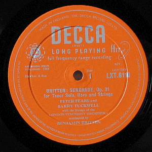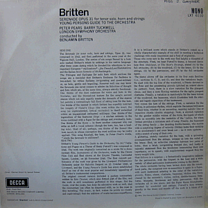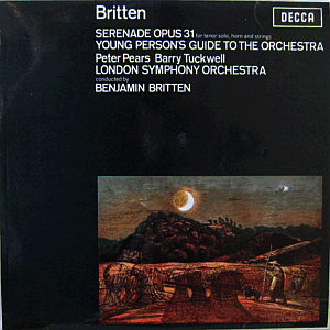 | Benjamin Britten's "Serenade Opus 31 for Tenor Solo, Horn and Strings" and "Young Person's Guide to the Orchestra Op. 34", performed by the London Symphony Orchestra conducted by Benjamin Britten himself. Solo vocals by Peter Pears, solo horn by Barry Tuckwell. Mono issue.