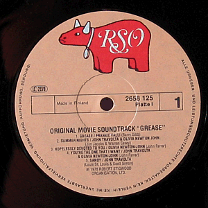| The original soundtrack from the motion picture "Grease" starring John Travolta and Olivia Newton-John. A total of 24 tracks by Frankie Valli(2), John Travolta & Olivia Newton John (3), Olivia Newton-John (2), John Travolta (2), Frankie Avalon (1), Stockard Channing (2), Cindy Bullens (2), Louis St. Louis (1), (Louis St. Louis & Cindy Bullens (1), Sha-Na-Na (6) plus two instrumentals. Hard-to-find Finnish pressing.