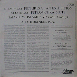 Alfred Brendel (piano) plays Mussorgsky, Stravinsky and Balakirev. Released originally by Vox in 1955, electronically reprocessed for stereo in 1969.