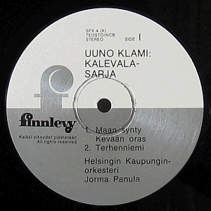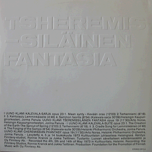 | Uuno Klami's "Kalevala-Suite, Op. 23: 1. The Creation of the Earth - The Sprout of Spring, 2. Terhenniemi 3. Cradle Song for Lemminkäinen 4. The Forging of the Sampo" and "Cheremissian Phantasy Op. 19", performed by the Helsinki Philharmonic Orchestra conducted by Jorma Panula. Arto Noras plays cello on "Cheremissian Phantasy". A rare Finnish only issue.
