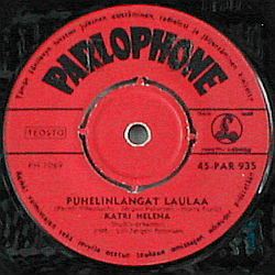 Punaruskea etiketti. Ylhäällä kaareva musta Parlophone-logo.