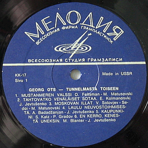 | Tummansininen etiketti valkoisella tekstillä. Ylhäällä kaareva valkoinen Melodiya-logo. |  | Kiiltävät kannet. Reunoissa kevyttä kulumaa ja pikkuryppyjä. Karvan verran kuluneet kulmat, joista yksi (> ylhäällä > oikealla) on myös taittunut / ruttaantunut. Takana sekä Kansankulttuurin että Melodiyan kuvalogot. |