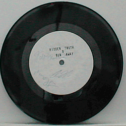 Blank white labels. Band name and track titles stamped in black. Autographed by the whole band.