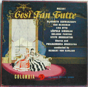 | A legendary recording of Mozart's highly popular opera "Cosi fan tutte" sung in Italian, featuring e.g. Elisabeth Schwarzkopf, Nan Merriman and Lisa Otto, conducted by Herbert von Karajan. Mono.