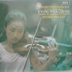Highly regarded South Korean violin player Kyung-Wha Chung with Andre Previn and The London Symphony Orchestra. Side A: Sibelius "Violin Concerto in D minor, Op. 47. Side B: Tchaikovsky: Violin Concerto in D major, Op. 35. Late seventies pressing.