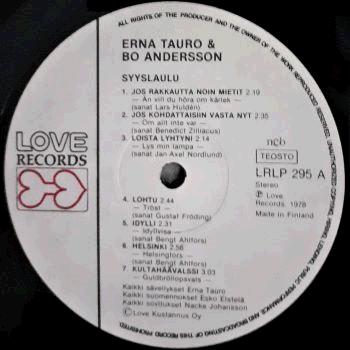 | Bo Anderssonin tulkitsemia Erna Tauron sävellyksiä Lars Huldénin, Bengt Ahlforsin, Bo Carpelanin, Tove Janssonin ja kumppaneiden runoihin, jotka yhtä lukuun ottamatta on suomentanut Esko Elstelä. Sovitukset Nacke Johansson, äänitys Måns Groundstroem. Loven albumituotannon loppupäätä.