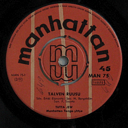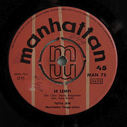 | Punaruskea etiketti kolmella vaalealla pystyraidalla. Ylhäällä iso kaareva musta Manhattan-logo, keskiössä levymerkin 'tuplaämmä'-kuvalogo. Jonkin verran kirjoitusta molemmin puolin. |  | |
