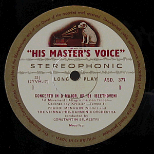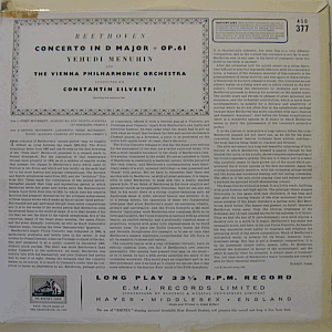 | Beethoven's "Violin Concerto in D major, op. 61", performed by Yehudi Menuhin with the Vienna Philharmonic Orchestra, conducted by Constantin Silvesti. Stereo issue, released also in mono as ALP 1799.
