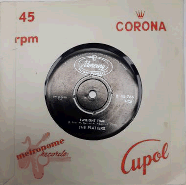 | A legendary American vocals group, formed in 1952 in Los Angeles, Californbia, one of the most successful vocal groups of the early rock and roll era. "Twilight Time" has been recorded by numerous groups over the years. However, the best-known version of the song was recorded by The Platters, ans became a No. 1 hit on both the pop singles and R&B best sellers lists in 1958 in the United States. Finnish issue of Mercury 71289X45 (USA, 1958), almost identical to the Swedish issue but five times rarer!