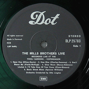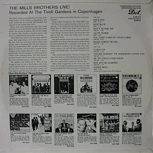 | A legendary American vocal quartet, formed in Piqua, Ohio in late 1920s, also one of the first black singing groups to cross racial lines. Late 1960s / early 1970s reissue of "The Mills Brothers in Tivoli. Live Recorded at the Tivoli Gardens in Copenhagen", Dot DLP 5004 (Denmark 1966). Stereo.