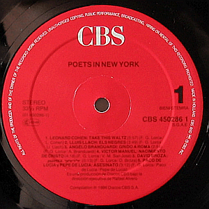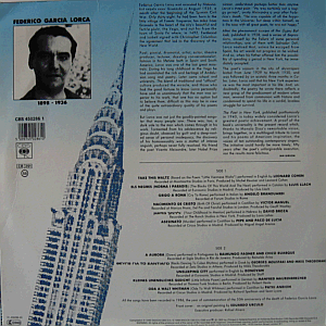 Federico Garcia Lorca's poems from his trip to New York in 1929 - 1930 (published posthumously in 1940 as "The Poet in New York"), composed and performed by Leonard Cohen, Lluis Llach, Angelo Branduardi, Victor manuel, David Broza, Pepe & Paco de Lucia, Raimundo Fagner & Chico Buarque, Georges Moustaki & Mikis Theodorakis, Donovan, Manfred Maurenbrecher and Patxi Andion, performed in English, Catalan, Italian, Castillian, Hebrew, Portuguese, Greek, and German...