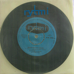 | Sininen etiketti. Ylhäällä iso sininen Rytmi-logo mustassa laatikossa. Hieman kirjoitusta keskiössä, kummallakin puolella. |  | Levy-yhtiön muovipussi. |