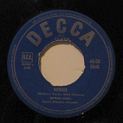 Tummansininen etiketti hopeateksteillä. Ylhäällä kaareva Decca-logo